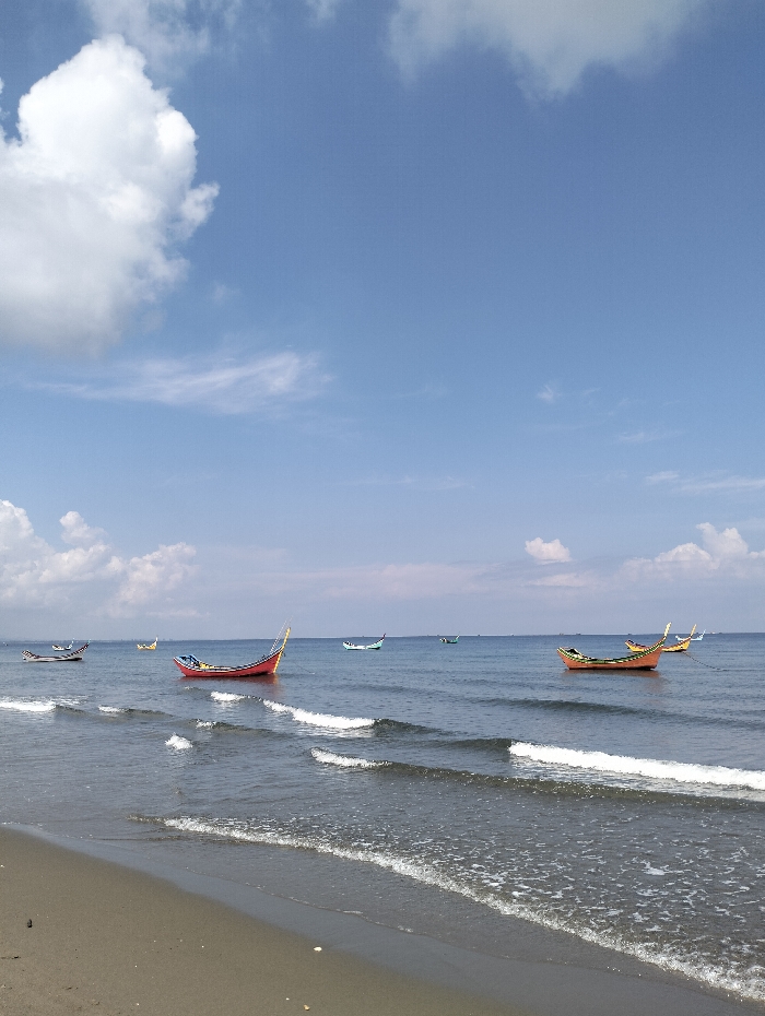 A serene beach scene under a blue sky dotted with fluffy white clouds. Gentle waves lap the sandy shore, punctuated by several colorful, traditional fishing boats anchored near the coast. The boats are various shades of orange and red. The calm ocean stretches toward the horizon under the bright sky.