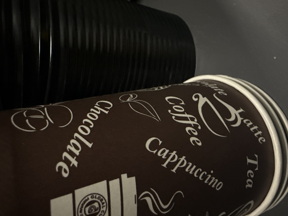 The scene is set indoors in Lupanovo, Russia. In the foreground and occupying the left half of the image, a stack of multiple brown disposable paper cups is present. The cups are adorned with white text and outline illustrations, displaying words such as "Chocolate," "Cappuccino," "Coffee," "Latte," and "Tea" in various orientations. A partial logo, including the text "GLOBAL CUP," is visible on the upper portion of the topmost cup. To the right of the stack of cups, a dark, possibly black, cylindrical or conical object with distinct horizontal ribbing is positioned. Both objects rest on a flat, dark gray surface. The background behind the objects is predominantly dark. The lighting is uneven, creating shadows and highlights, and no individuals or actions are depicted.
