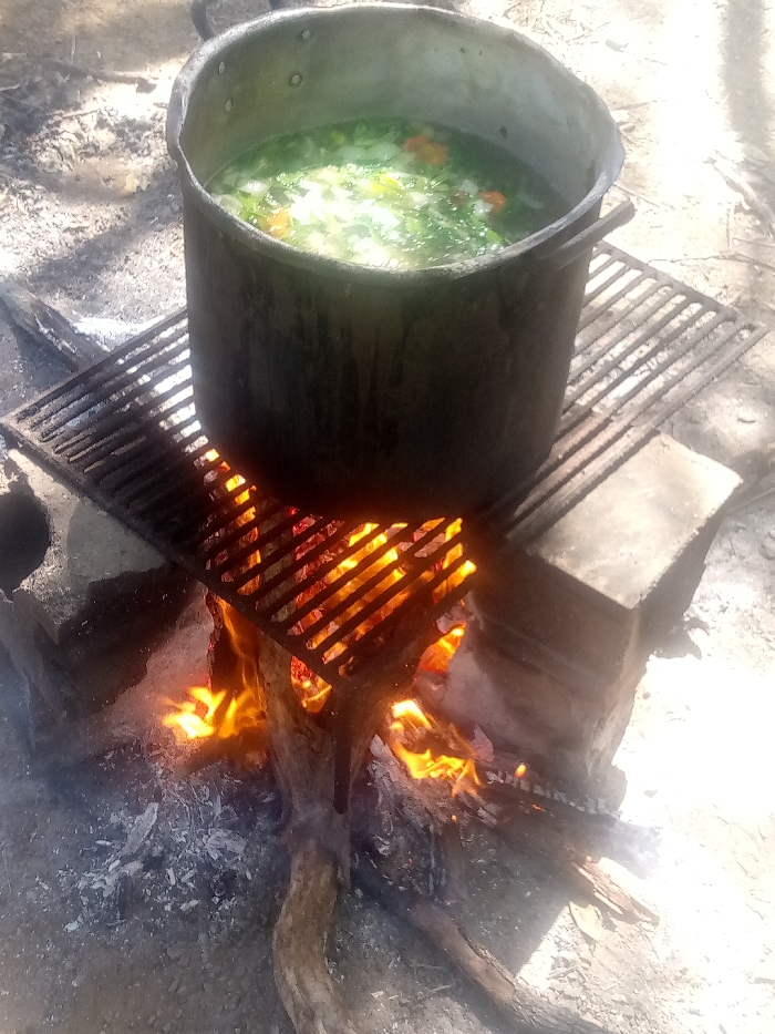- "An outdoor scene in Las Guevaras, Venezuela, depicts a large, dark metal pot containing a light green liquid with chopped green vegetables and orange pieces simmering over an open fire" by FM-Q5qB73, licensed under CC BY 4.0