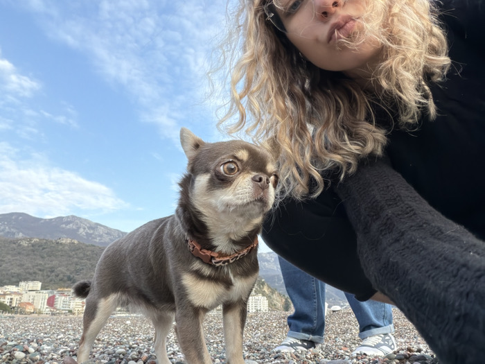 - "An outdoor low-angle shot on a pebble beach in Rafailovići, Montenegro, features a small Chihuahua and a partially visible person" by FM-0Olrx1, licensed under CC BY 4.0