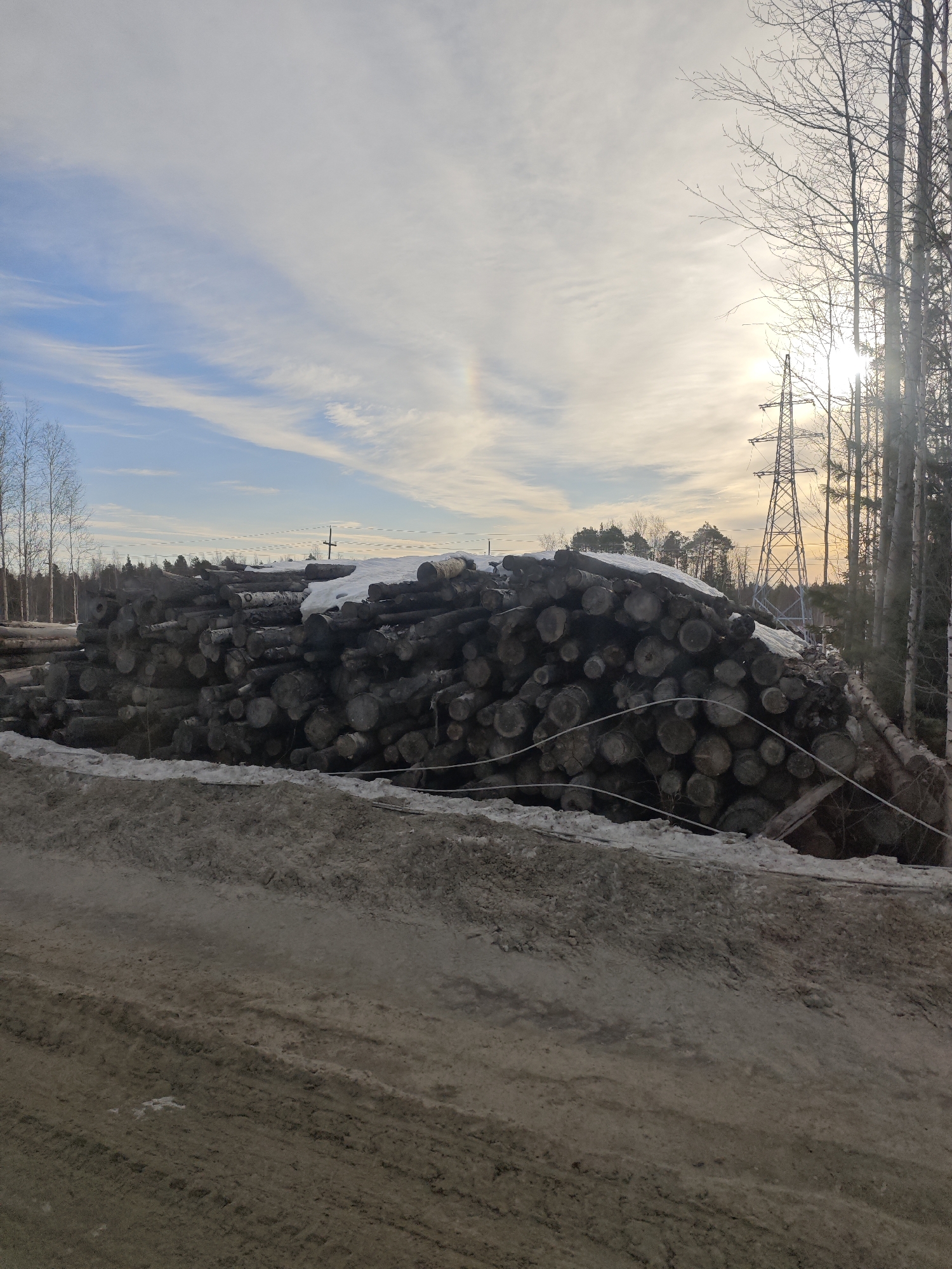 A large stack of logs is positioned adjacent to a dirt road, partially covered with snow. Behind the logs are trees and a power line structure is visible in the background to the right. The sky is a mix of blue and clouds, with the sun shining through the trees in the distance. The location is Unknown, Russia.