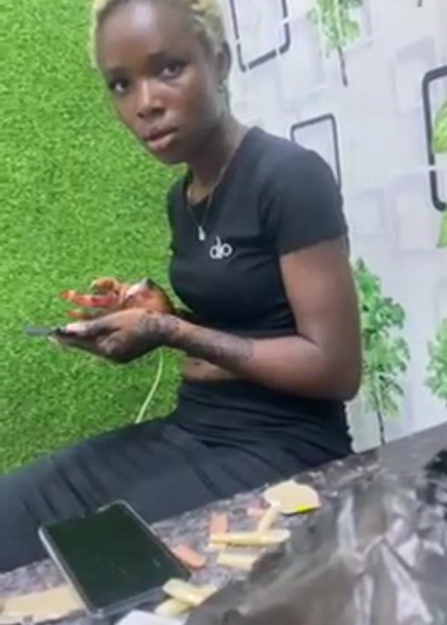 A woman with short, light-blonde hair is sitting on a stool behind a desk, looking at a phone in her hands. She is wearing a black, short-sleeved shirt with "alo" printed on it and a long black skirt. She has tattoos on her forearms. There are two phones, a brush, and debris on the desk in front of her, which seems to be a work space. Behind her is a green wall with faux plant decoration and a white wall with an abstract tree branch design. The woman looks up from her phone at the camera and states "three one."