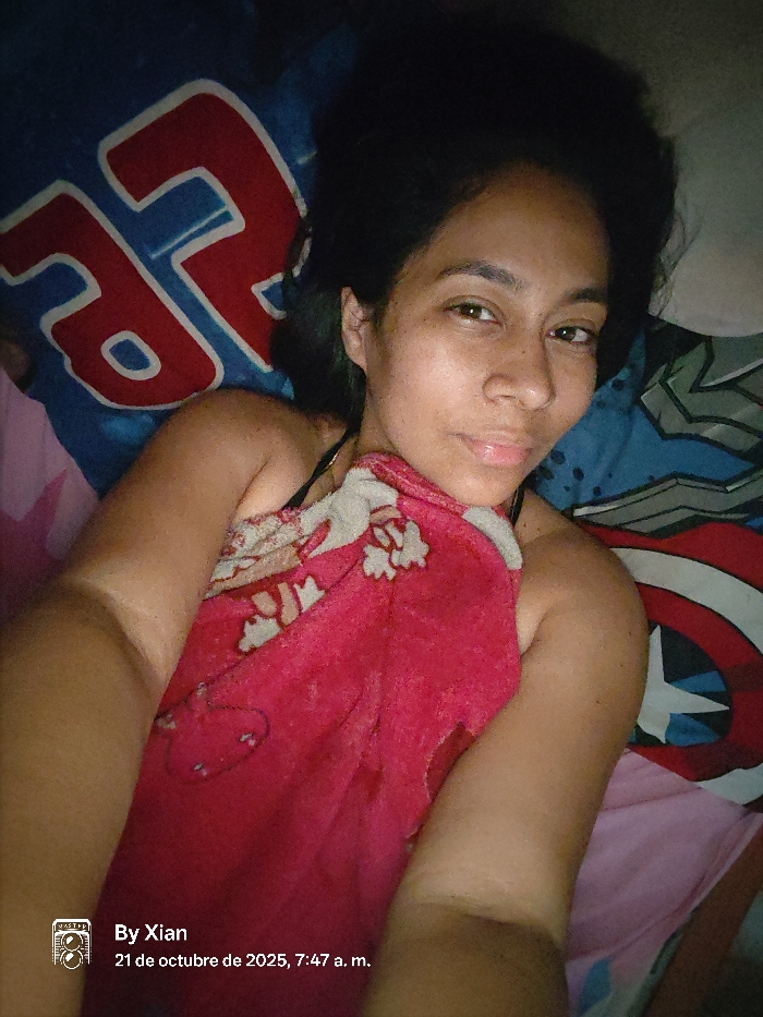 A woman lies in bed covered with a red and white patterned blanket. Her dark hair is tousled around her head. She looks directly at the camera with a slight smile. Behind her are patterned sheets, one with a large red and blue graphic design and the other with a Captain America shield design. The image includes text at the bottom indicating it was taken on October 21, 2025, at 7:47 a.m. by Xian.