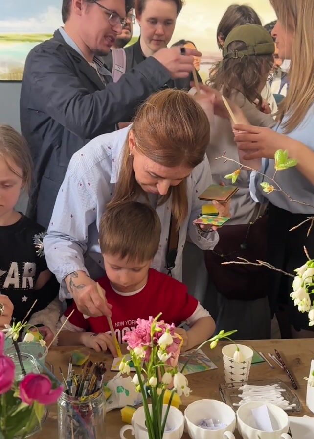 A crowd of people, including adults and children, are gathered around a wooden table. A woman in a light blue striped shirt is guiding a young boy in a red t-shirt as he works on a craft project. There are flower arrangements and art supplies on the table, along with small bowls of white paper pieces. Several other people are watching or participating in the activity. A painting hangs on the wall in the background. The lighting is bright and natural.