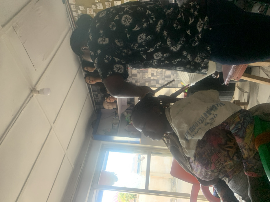 Inside a brightly lit room, a stylist braids a client's hair