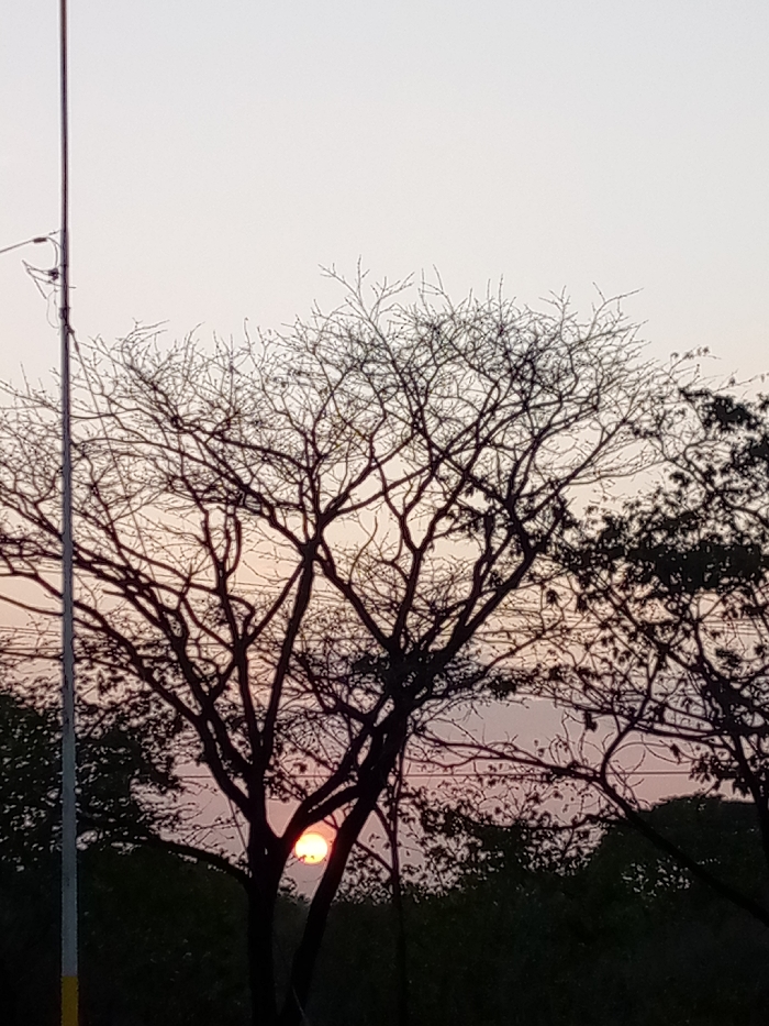 The image depicts a sunset or sunrise over Las Guevaras, Venezuela. The scene is dominated by the silhouette of a large, bare deciduous tree with intricate branching, positioned centrally. The sun, a circular orange-red orb, is partially visible through the lower branches of this tree, slightly to the left of the image's vertical center. The sky exhibits a gradient of pale pink and orange hues near the horizon, transitioning to a lighter, almost white-grey tone towards the top. To the right, another tree with denser, dark foliage is partially visible, also in silhouette. On the far left, a utility pole, primarily white with a yellow base stripe, extends vertically through the entire frame, featuring a visible crossarm and wiring in the upper left. No people or specific actions are discernible. The lower portion of the image displays dark, indistinct foliage, suggesting ground-level vegetation.