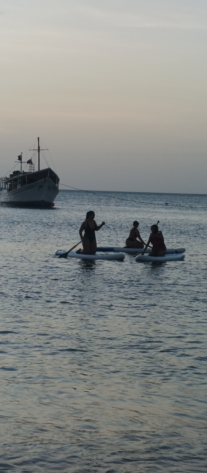The image displays a twilight marine scene in Juan Griego, Venezuela. Three individuals are observed kneeling on individual stand-up paddleboards on calm, dark water. The leftmost individual wears a dark one-piece swimsuit, holding a paddle with the blade submerged on the right side. The middle individual, wearing a lighter two-piece swimsuit, kneels facing right. The rightmost individual, wearing a dark swimsuit, kneels facing slightly left, holding a paddle with its blade in the water. In the background, a large, dark-hulled vessel, possibly a fishing boat or small cargo ship, is moored on the left side of the frame. The boat features a prominent mast with dark flags or banners, a cabin structure, and its bow points slightly right. A dark rope or line extends horizontally from the boat across the water, passing between the paddleboarders and continuing out of frame to the right. The sky above is a pale, diffused grey-blue, with a subtle gradient transitioning to a lighter hue near the horizon.
