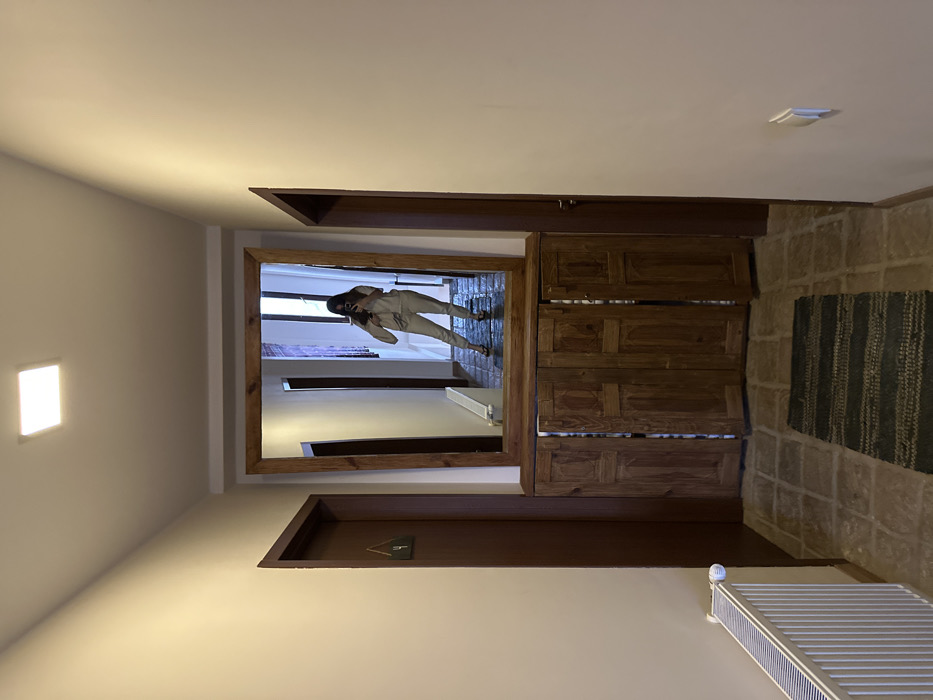 The image displays an indoor hallway in a building located in Sighnaghi, Georgia. A large rectangular mirror, framed in dark wood, is mounted centrally on a light-colored wall. Directly beneath the mirror is a dark wooden cabinet featuring four doors, with the two central doors slightly ajar, revealing a darker interior. Reflected in the mirror is a person, positioned further down the hallway, appearing to take the photograph with a smartphone. This individual is dressed in a light-colored, possibly beige or khaki, long-sleeved top and matching pants, with dark sandals. The reflection also shows a continuation of the hallway with another white radiator on the left, and what appears to be a striped purple or dark red fabric hanging at the far end, near a visible window or light source. To the left of the mirror and cabinet, a closed brown wooden door is present, affixed with a triangular wooden sign bearing the number '4'. Below this door, a white panel radiator is mounted on the wall. To the right of the mirror and cabinet unit, another closed brown wooden door with a metallic handle is visible. The floor consists of large, light brown square tiles, and a dark gray striped woven mat is placed directly in front of the wooden cabinet. The walls are light-colored, and the ceiling features a single square, flush-mounted white light fixture, which is illuminated.