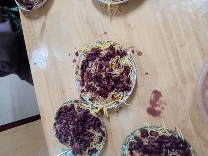 This image depicts a domestic scene at an unspecified indoor location in the city of Jiangjin, China. The primary focus is a light-colored wooden table where multiple plates of food are arranged. Three plates are clearly visible, each containing a serving of yellow noodles topped with a substantial quantity of dark red beans and a reddish sauce, possibly containing finely chopped red onions. A metal spoon or fork is present in the leftmost plate. Reddish-purple liquid, consistent with sauce from the food, is spattered and spilled in several areas directly onto the wooden table surface, notably a larger irregular stain centrally located. In the upper right background, out of focus, a portion of a person's upper body and arm, clad in dark clothing, is partially visible, indicating a seated individual at the table.