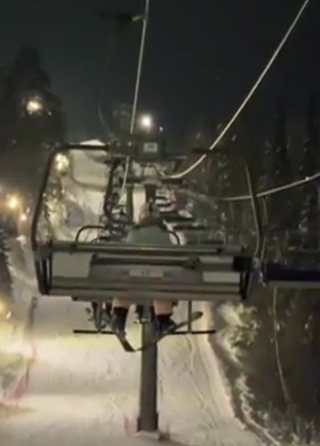 two people riding a ski lift at night. The lift ascends a snow-covered hill illuminated by lights. Evergreen trees are visible on either side of the slope. The camera angle is from behind, looking up at the lift.