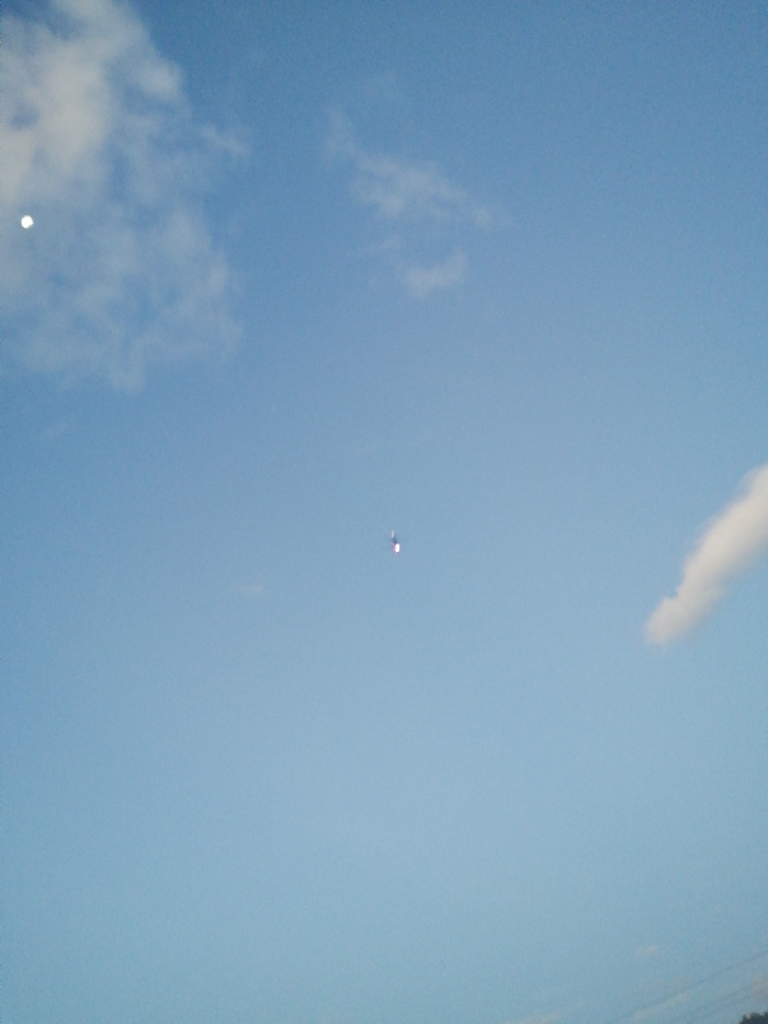 The image displays an outdoor daytime scene dominated by a clear, light blue sky with scattered white clouds. In the upper left quadrant, a bright white circular object, consistent with the sun or a bright light source, is partially obscured by a diffuse white cloud. Centrally positioned against the sky, a small, dark, elongated object is visible, emitting a distinct reddish-orange plume or glow from its lower end, indicating propulsion. A larger, more defined white cloud formation is present in the lower right quadrant. The environment consists solely of open sky; no ground-level features, structures, or individuals are discernible. The specific location within Bogota, Colombia, cannot be determined from the visual information provided.