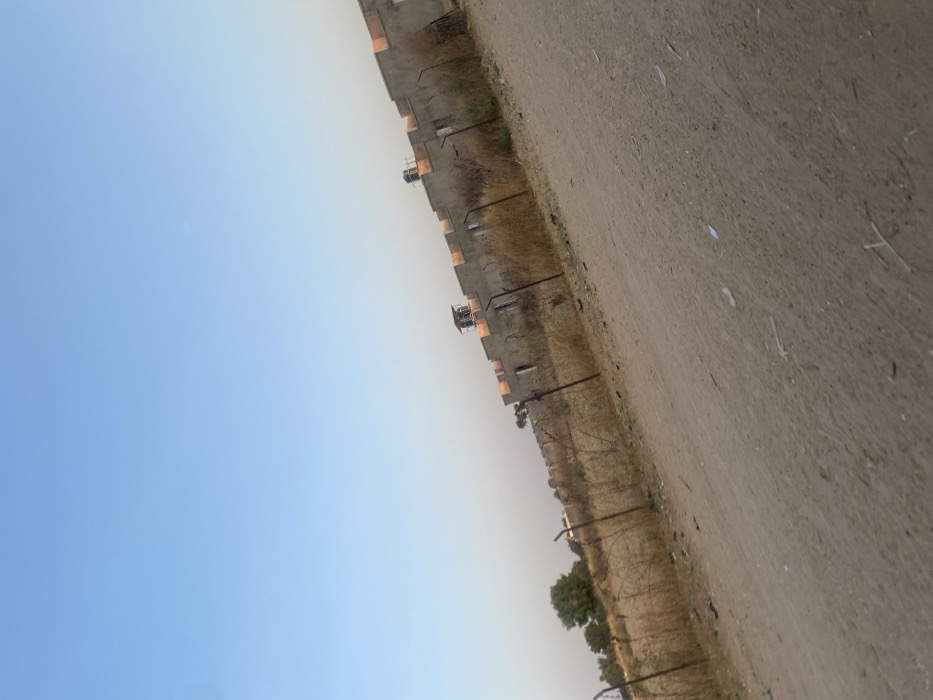 A tilted view shows a pale blue sky on the left, fading towards the horizon. A dirt road dominates the right side of the frame. Along the center runs a low wall or series of buildings with watchtowers. Barbed wire fences parallel the wall. Scattered patches of dried vegetation and small trees appear along the ground beside the wall. The overall scene suggests a rural or possibly a border area.