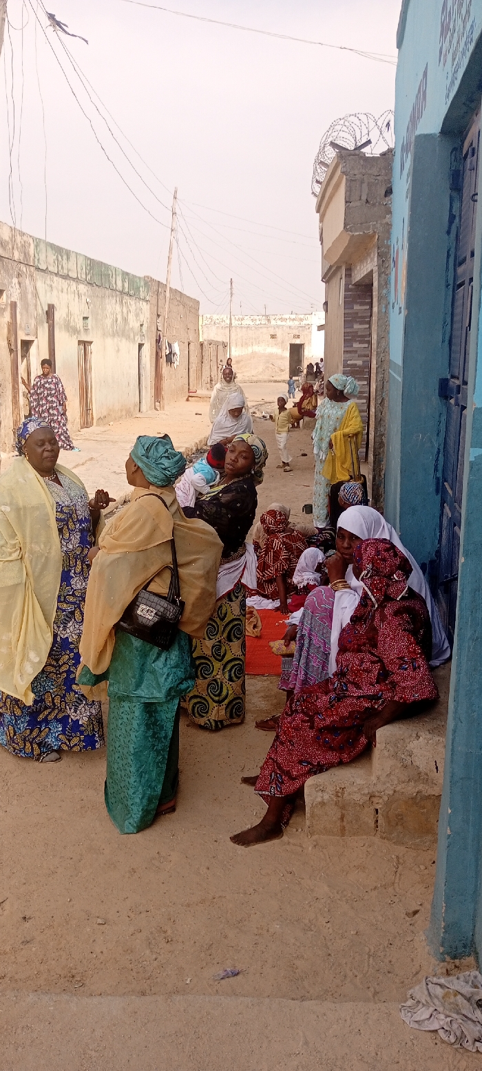 The scene is a narrow street in Panshekara, Kano, Nigeria. The street is lined with simple, low-rise buildings made of concrete, and the ground is dirt. There is a significant number of women gathered in the street. Many of the women are dressed in traditional Nigerian clothing. The women are interacting with each other. Some are standing and talking. Others are sitting on the ground, or on a low step in front of a building. One woman is wearing a yellow headscarf and a yellow dress. Another woman is wearing a blue headscarf and a green dress. A young child is standing in the middle of the street, while another, a young boy, is seated on the ground nearby. Several of the women are wearing scarves covering their heads. There is a building on the right side of the photo, which has a blue exterior, and a black door. There is also a building on the left side of the photo. It is impossible to ascertain what is occurring. There is no indication of violence or aggression, but nor is there anything in the scene to suggest the women are engaged in anything more than ordinary social interactions.