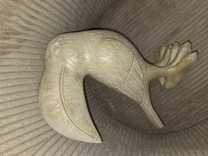 The image presents a single, static, light-toned sculpture depicting a stylized avian figure, likely a toucan or similar large-billed bird. The sculpture, which appears to be crafted from a material resembling carved stone, resin, or plaster, exhibits an overall off-white to light beige coloration with visible, irregular brownish-yellow patination or staining, particularly pronounced in recessed areas and on its base. Key carved details include a prominent, elongated, downward-curving beak adorned with linear and wavy patterns, a defined circular eye on the head, and intricate feather-like carvings across the body and wings. The bird stands on two short, stout legs culminating in splayed, paddle-like feet that form a stable base. The object is positioned on a light brown, vertically ribbed textile surface, consistent with upholstered furniture. No other objects or individuals are present. The scene is illuminated by an unseen light source, generating soft shadows that highlight the textures of both the sculpture and the background fabric. This image was captured in an unspecified interior location within Blainville-sur-Orne, France.