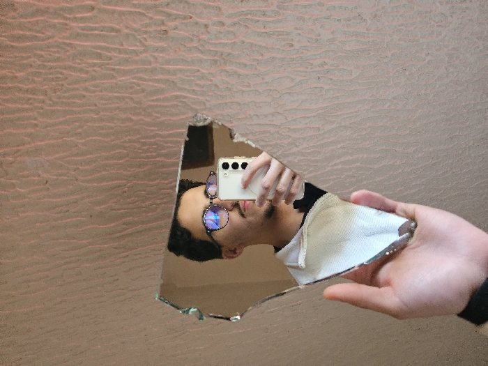 - "A close-up image depicts a left hand holding an irregularly shaped, broken mirror shard" by FM-nrvLj2, licensed under CC BY 4.0