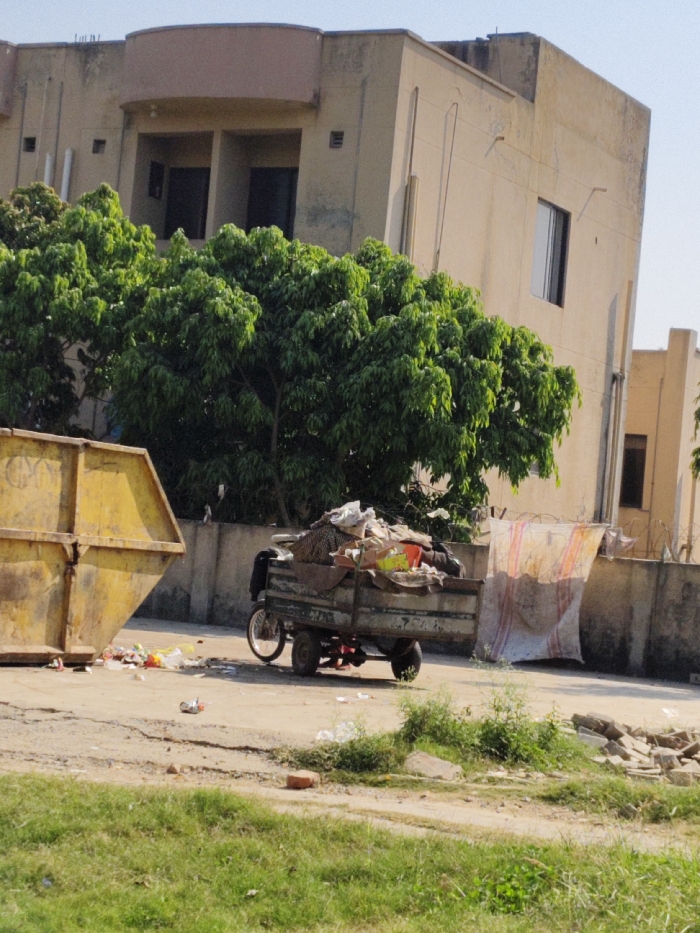 This image captures an urban street scene in Blue Area, Pakistan, under clear daylight. In the foreground, a large, yellow, open-top refuse dumpster stands on the left, partially filled with trash, with additional debris scattered around its base on the cracked, unpaved ground. Adjacent to the dumpster, on the right, a three-wheeled motorized cargo vehicle, appearing to be a motorcycle-drawn trailer, is stationary and heavily loaded with various items of refuse and salvaged materials, including textiles, plastics, and cardboard. The ground around this vehicle also shows scattered litter. Behind the vehicle and dumpster, a low concrete wall topped with barbed wire extends across the mid-ground. A large, torn, light-colored fabric sheet is draped over a portion of this wall on the right side. Dense green foliage from several trees occupies the central mid-ground, obscuring the lower sections of the background structures. Above the tree line, two multi-story buildings are visible against a clear blue sky. The building on the left is light brown, featuring a curved balcony on an upper level and two dark, recessed openings below. The building on the right is a lighter beige, taller, and displays a single dark rectangular window on its upper section. Both buildings exhibit signs of wear and surface discoloration. No individuals are present in the scene, and no specific actions or interactions are depicted.