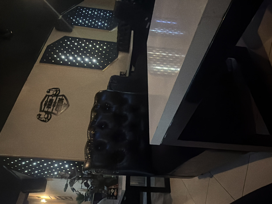 The scene depicts the interior of an establishment in Momchilgrad, Bulgaria. In the foreground, a rectangular table with a smooth, white, reflective top and a dark, possibly black, base extends diagonally from the lower left to the middle right. Behind this table, a dark, upholstered booth with button tufting is positioned. To the left, another white-topped table and a potted plant are partially visible. The wall is light-colored, featuring a metallic wall art piece resembling a shield flanked by stylized bicep arms, with "NO PAIN NO GAIN" inscribed. To the right of this art piece and further left, two vertical, dark panels are mounted on the wall, each containing arrays of small, bright, point-source lights. The ceiling is dark-colored. The area is illuminated by artificial light sources. No individuals are clearly visible, and no actions or interactions are discernible.