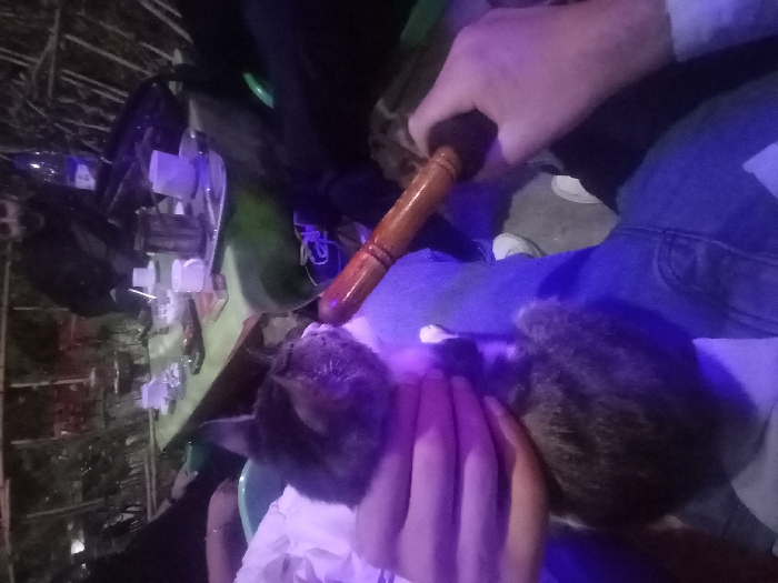 The image captures a nighttime outdoor social scene in Munin, Syria. In the immediate foreground, the lower torso of an individual, dressed in blue jeans, is visible. This person's left hand cradles a small, mostly dark-furred cat with white facial markings, which rests on their lap and faces towards the right. The individual's right hand holds the wooden mouthpiece of a shisha pipe, positioning it near the cat's head. A light green table in the midground holds several items, including multiple white ceramic cups, a metal ash receptacle containing glowing embers, a wooden mug, a blue water bottle, and a dark bag. Two other individuals are present: one male, with a visible beard, is seated behind the table to the right, facing towards the foreground, while a third person's arm and shoulder are partially visible on the far left behind the table. The background is dimly lit and out of focus, revealing what appears to be a metal railing and indistinct foliage.