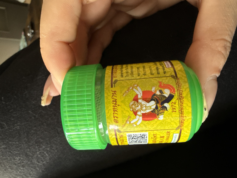 A human left hand, with light skin tone and a long, light-colored fingernail on the index finger, grasps a small, cylindrical jar. The jar features a bright green, ribbed screw-top lid and a yellow label adorned with Thai script and a red circular emblem. Within the emblem, a white figure resembling Hanuman, depicted with multiple arms wielding weapons, is visible. Below the figure, the year "1972" is printed. A QR code and the English word "INHALER" are also present on the label. The visible contents of the jar below the label are a light green substance. The background is predominantly dark, textured fabric, consistent with clothing, with a blurred lighter object partially visible in the upper right. No identifiable markers for the city of Sint-Niklaas, Belgium, are present in the scene.