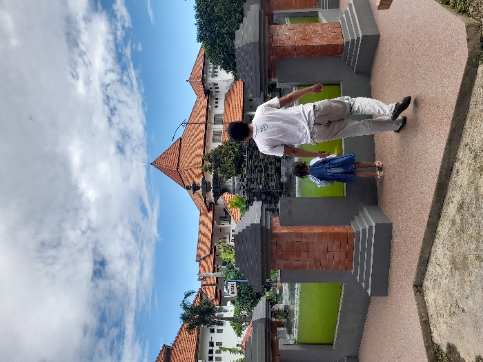 A man wearing a white shirt and beige pants walks away from the camera, while a young girl wearing a blue dress and white shoes stands near a fountain with her back to the camera. There is a shallow pond with green water in the foreground. The scene is a courtyard located in front of an orange-roofed building. The building is located at the coordinates -7.434 latitude, 112.72 longitude, in the city of Kecamatan Buduran, Indonesia. There are green trees and shrubs growing around the courtyard and the building. There is also a tall streetlight visible in the background. The sky is partly cloudy.