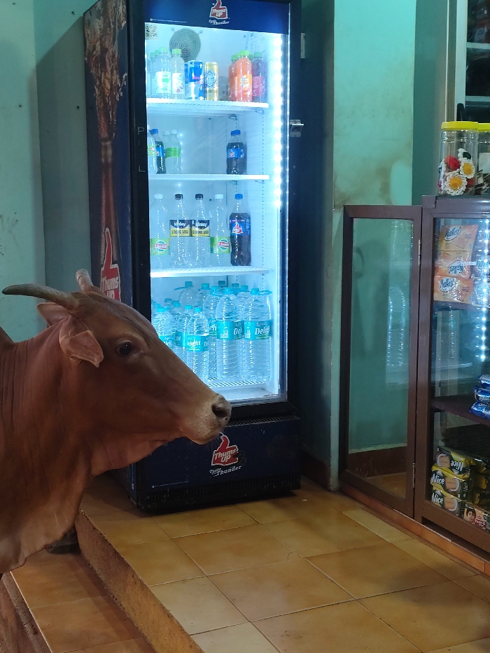 - "A light brown zebu cow, possessing small horns, stands on a tiled step inside a retail establishment located in Arambol, India" by FM-yj6ly1, licensed under CC BY 4.0