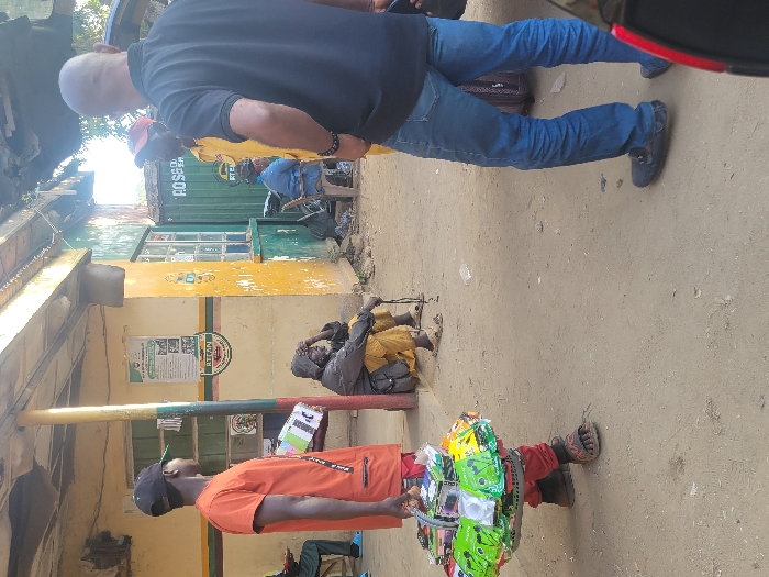 A man in an orange shirt, black pants, and sandals stands on a dirt path, carrying a circular vendor tray laden with items. Another man sits on the ground nearby. A building with a yellow and green exterior forms the backdrop. Two men are seen standing in the background, seemingly observing the scene. One is wearing blue jeans and a black shirt, and the other is wearing yellow.