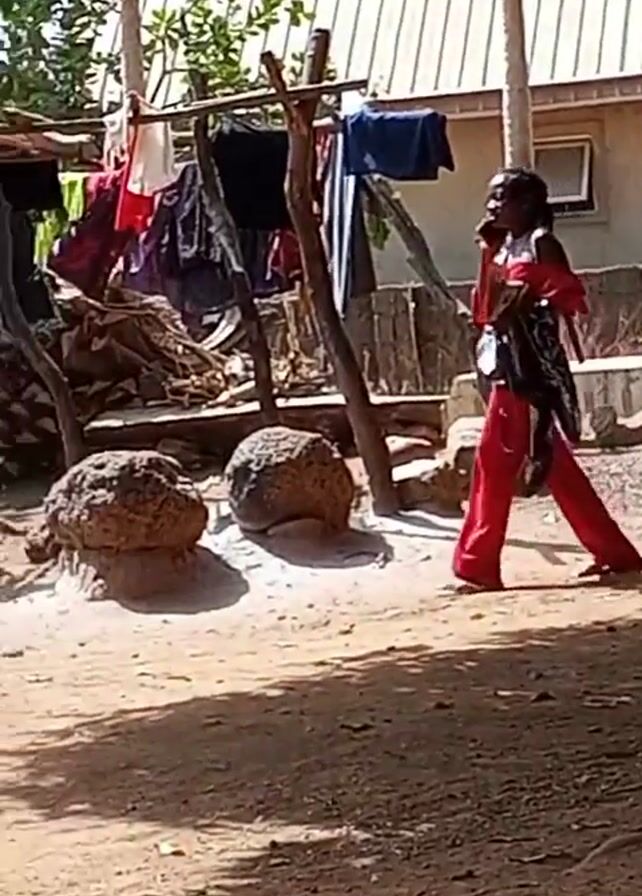 A woman in red pants and a matching shirt is walking on a dirt path, with a folder in her left hand and talking on a cell phone held to her right ear. The background shows a wooden structure with laundry hanging from it and a building with a metal roof. There are also large rocks visible in the scene. The scene appears to be a yard or outdoor area.