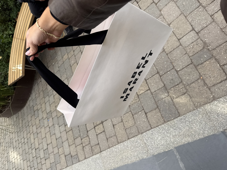 A close-up, first-person perspective image captures a person's right hand holding a white shopping bag outdoors in Las Rozas De Madrid, Spain. The hand, exhibiting manicured fingernails, is adorned with a delicate gold-toned link bracelet. The forearm is partially visible, covered by a brown jacket sleeve. The rectangular white paper shopping bag displays "ISABEL MARANT" in prominent black capital letters on its side and features black fabric handles, which the hand grips. The ground beneath is paved with rectangular, light grey interlocking pavers. A smooth, darker grey border runs along the left edge of the paved area. In the background, a curved wooden slatted bench with visible metal supports is present, positioned behind which is green foliage contained within a dark, raised planter. The scene is illuminated by natural daylight.