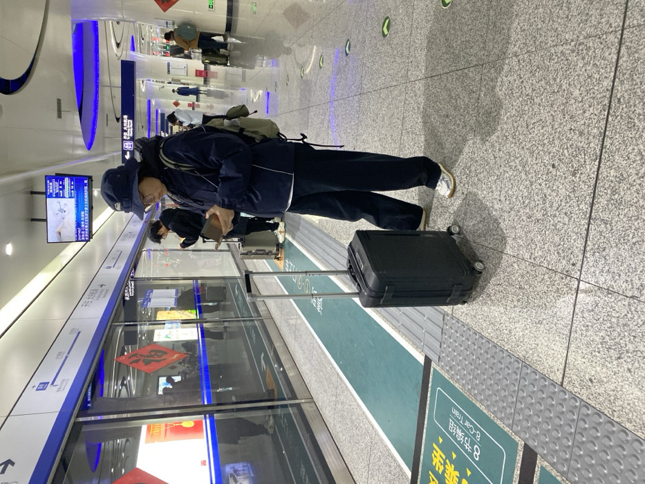 In an indoor transit station, a person in a navy jacket, dark pants, white sneakers, and a hat stands by a platform edge. They hold a phone and have a backpack. A black suitcase is beside them. A digital display shows train information above sliding glass doors adorned with festive decorations. Other people are visible in the background. The floor is speckled gray. Signage indicates this is for an 8-car train. The station has a modern, curved ceiling with blue lighting.