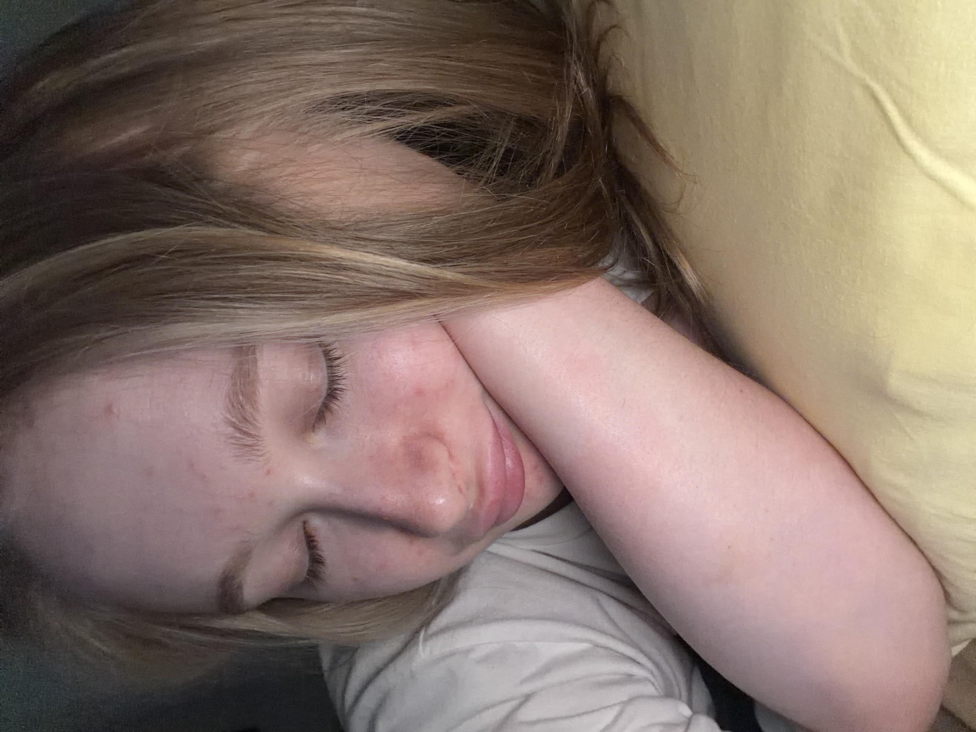 A light-skinned person with blonde hair is asleep