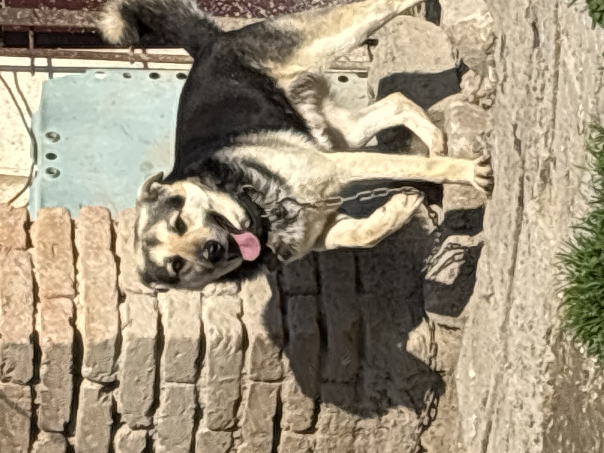 In Slavyanovo, Bulgaria, a bicolored dog is depicted standing outdoors under bright sunlight. The animal, exhibiting tan, black, and cream fur, wears a dark collar with a metal chain attached, extending downwards. It faces slightly right, looking towards the viewer with its mouth open and a pink tongue exposed. To the dog's left, a weathered light brown brick wall casts a distinct shadow. To its right, a light blue metal structure with visible circular perforations is present, behind which a reddish-brown textured surface is partially discernible. The ground beneath the dog consists of uneven, light-colored terrain with sporadic patches of green foliage in the foreground.