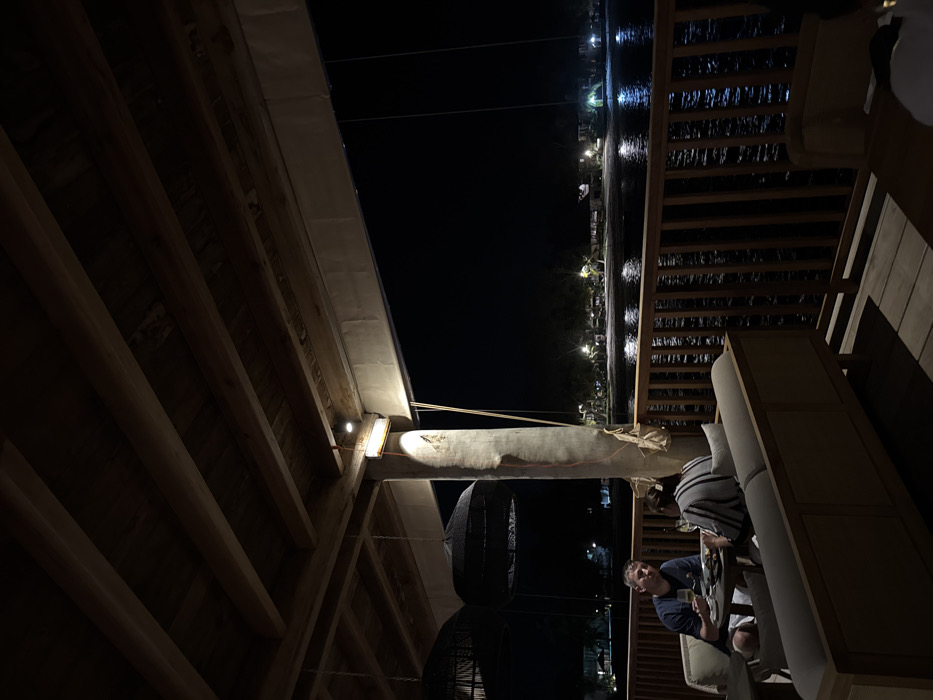 A dimly lit outdoor seating area is visible at night. A wooden structure with exposed beams forms a partial enclosure above. Beyond this, there's a view of dark water with some distant lights reflecting off its surface. A man is seated at a table, holding a small glass. Part of a sofa with light-colored upholstery is adjacent to the table. A hanging lampshade hangs above the table.