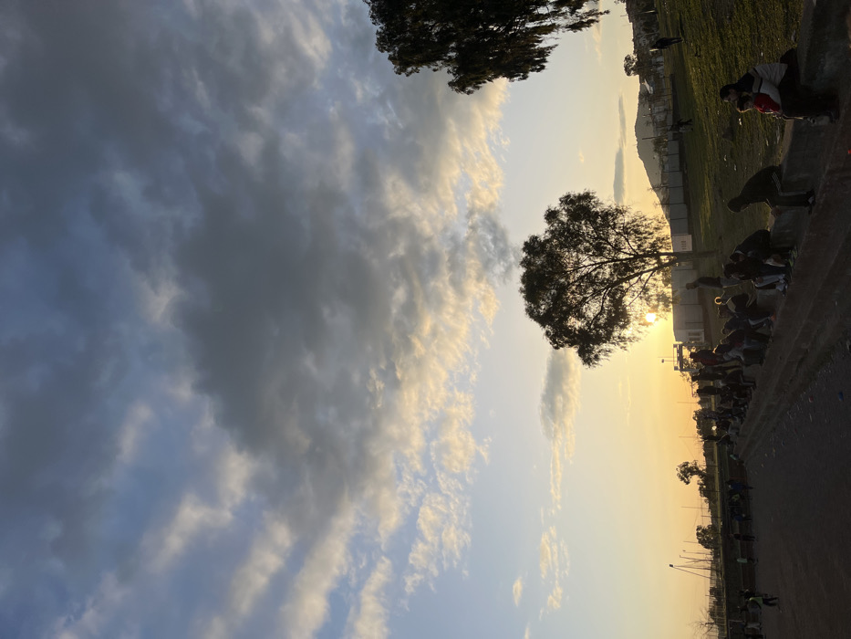 The image captures an outdoor scene at dusk or dawn in Fez, Morocco, characterized by a low sun setting or rising on the horizon, casting a golden glow across the landscape. The sky above is partially cloudy, with blue patches and various white, yellow, and grey cumulus clouds. In the foreground and mid-ground, a dirt or dusty field is visible on the left, where several small figures, possibly children, are actively engaged. To the right, a horizontal concrete or stone retaining wall or stepped structure features approximately two dozen individuals, predominantly adults and some children, sitting or standing. They are largely silhouetted against the light. A prominent, silhouetted tree with sparse foliage stands near the center-right, directly in front of the sun. Further right, another similar tree is partially visible. Beyond the seated figures and the field, a grassy hillside slopes upwards, upon which a few scattered individuals are seen, including one adult holding a child. Indistinct white structures, possibly buildings or barriers, are visible on the distant hillside, beneath a hazy horizon.