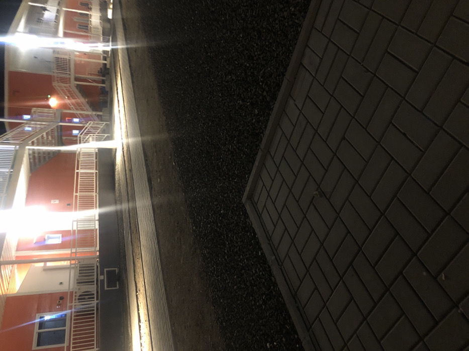 A low-angle, nighttime perspective presents a modern, multistory building with orange walls and white railings on the left. Bright lights create stark reflections on the structure. Adjacent to the building is a strip of gravel, followed by a section of rectangular paving stones. The pavers fill the right side of the frame and are laid in a herringbone pattern. The overall tone is dark, with the artificial light accentuating textures and patterns.