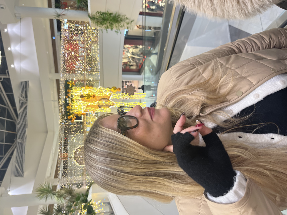 A fair-skinned woman with blonde hair and glasses gazes upward. She wears a beige quilted jacket over a dark shirt and a white cardigan. Black fingerless gloves adorn her hands. The background reveals a bright, indoor shopping mall with Christmas lights and decorations. Plants add a touch of greenery to the scene.