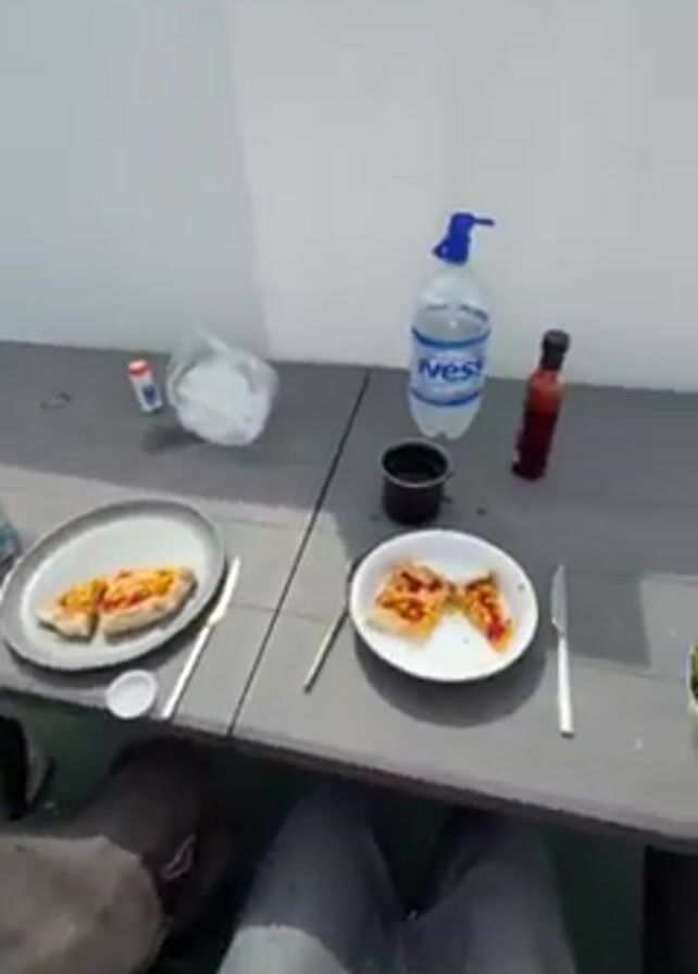 three people having lunch on a rooftop on a sunny day. They are sitting at a gray folding table set with plates of pizza, a salad in a stainless steel bowl, water bottles, cups, silverware, and a small bottle of what appears to be hot sauce. One person is pouring water from a large bottle into a glass. A second person is transferring some of the salad onto his plate. The camera pans up to show the urban skyline in the background, with various buildings and a partly cloudy sky. The rooftop is painted green and white, with some blue accents on the edge.