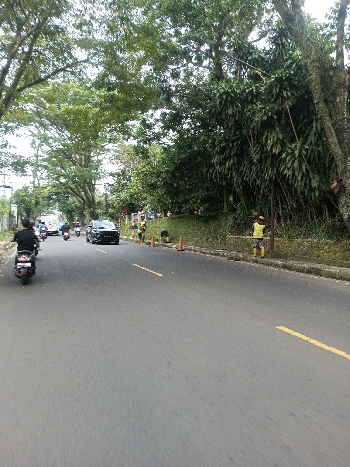 The image depicts a two-lane asphalt road in Khajuripada, India, viewed from a low angle, looking forward along the direction of traffic. A solid yellow line marks the right edge of the travel lane. On the left side of the road, multiple vehicles are in motion, including a black sedan, several motorcycles, and a white bus with red trim further in the distance. The closest visible person is a motorcyclist in a black shirt, riding a dark scooter with a visible license plate frame, moving away from the viewer in the left lane. On the right side of the road, separated by a concrete curb and a low stone retaining wall, is a grassy embankment leading to dense tropical foliage and trees. At least three individuals are present on this right shoulder/embankment area, wearing yellow high-visibility vests and yellow boots, indicative of road maintenance or construction work. Two orange traffic cones are visible on the shoulder near these workers. One worker stands upright, facing the embankment, while two others are bent over, appearing to be working near the ground. The environment is lush with greenery, and the sky is overcast.