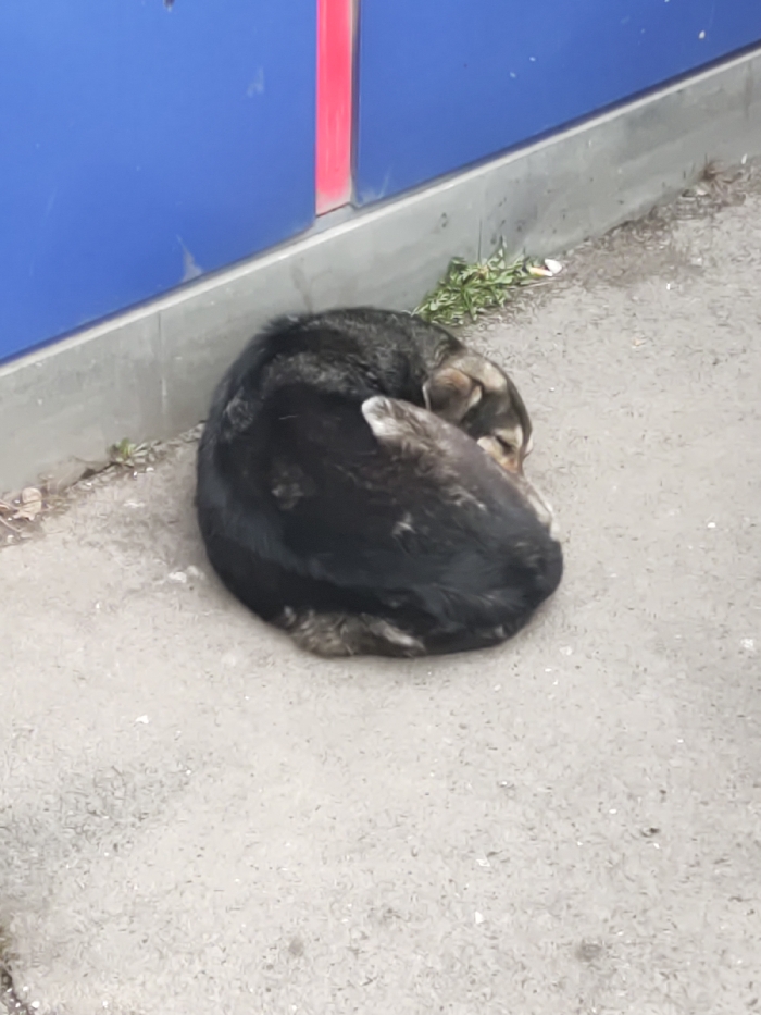 The image depicts a single canid, identified as a dog, resting on a light-grey paved surface in the city of Abovyan, Armenia. The dog is curled into a tight, circular posture, with its head tucked towards its body. Its fur is predominantly dark grey or black, with lighter brown or tan markings visible on its head and parts of its legs. In the background, a vertical blue surface is visible, suggesting a wall or barrier, interrupted by a narrow, vertical red stripe. A thin line of green vegetation is present along the base of the blue structure where it meets the paved ground. No human subjects or interactions are present in the frame.