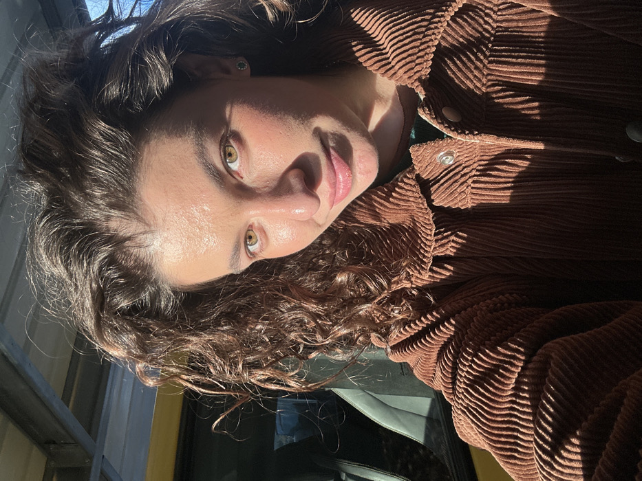 A person poses close to the camera, wearing a brown corduroy jacket with visible buttons. They have curly, dark hair and light-colored eyes, appearing to be in the sunlight. Part of a car interior is visible in the lower part of the frame, suggesting the setting.