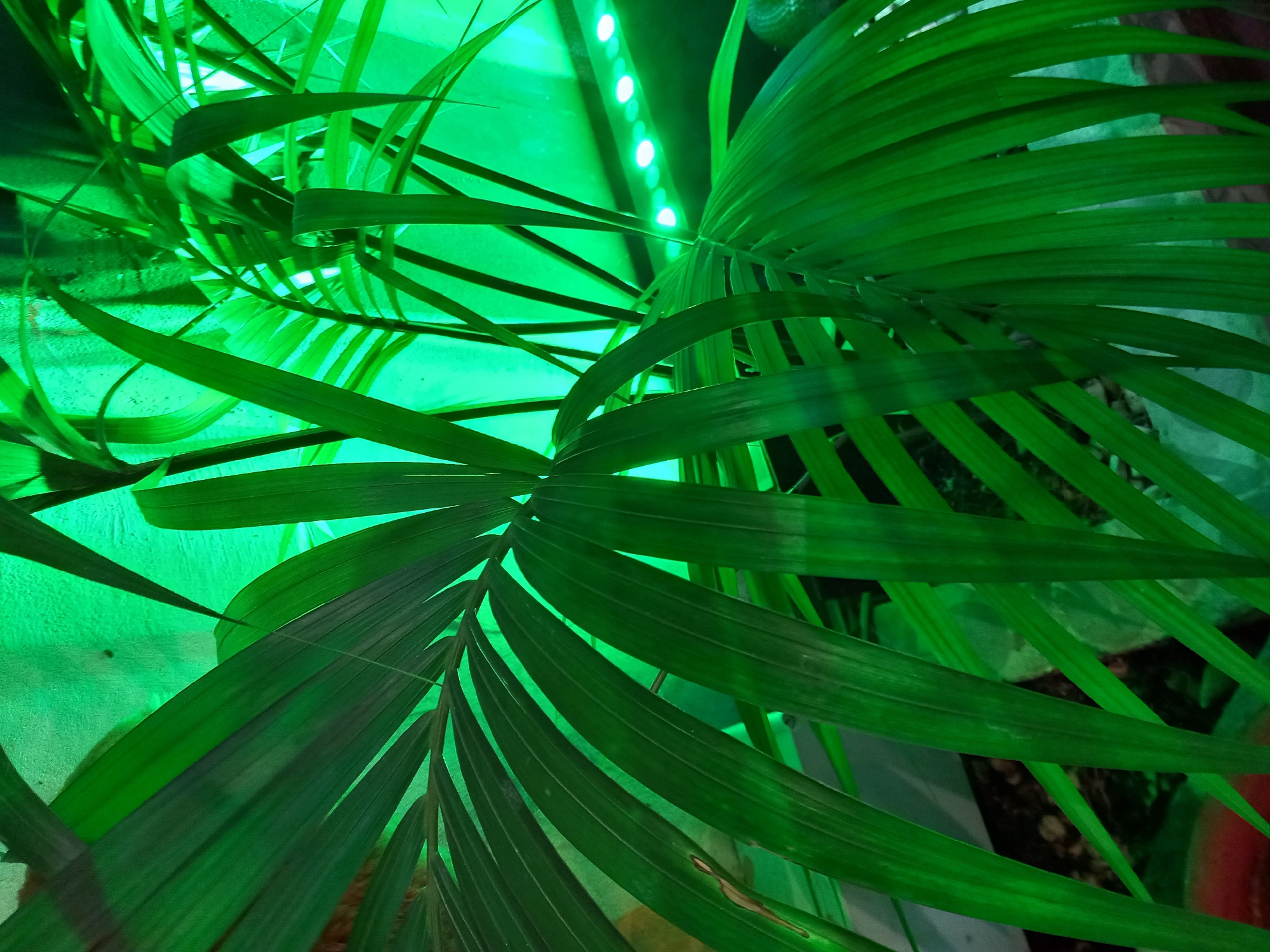 A close-up vertical shot features the lush foliage of a palm-like plant under intense artificial green illumination