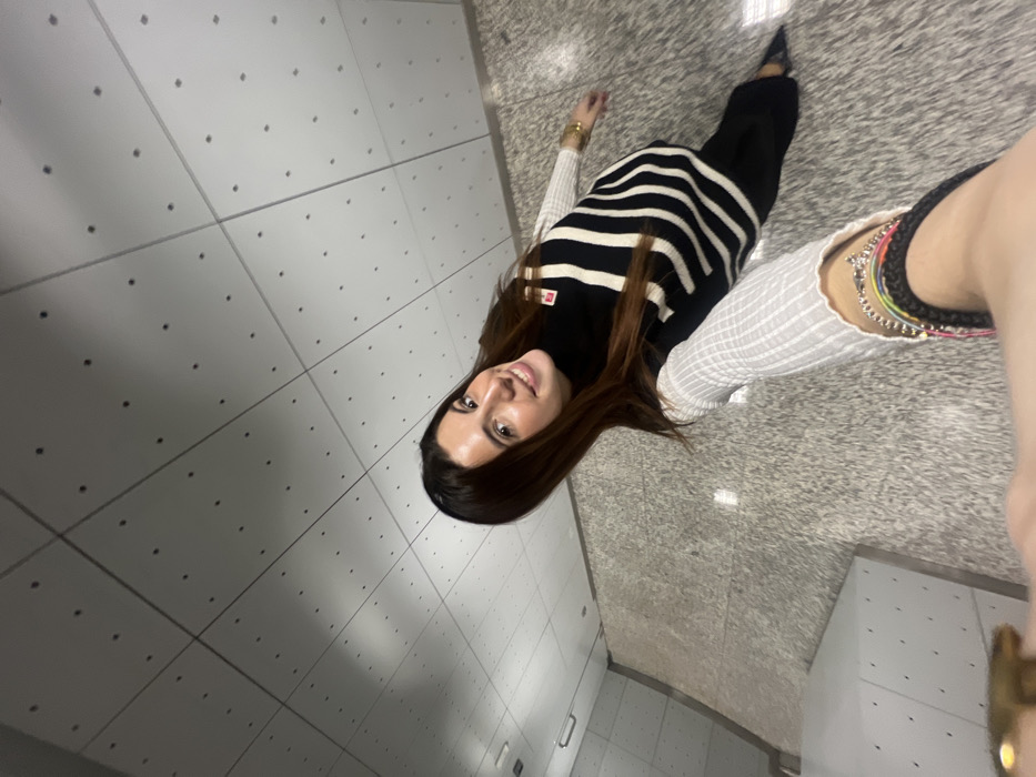 This high-angle, selfie-style photograph captures a smiling female subject in an indoor public or commercial space in the city of Unknown, Unknown