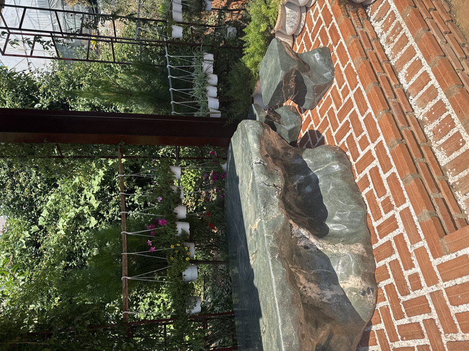 The scene depicts an outdoor garden seating area in the city of Đa Lộc, Vietnam. A large, dark green stone table with an irregular, rough-hewn surface occupies the foreground, accompanied by two smaller, similarly styled stone stools positioned to its right. The stone exhibits natural marbling and lighter veining. The ground beneath the seating consists of a red brick patio laid in a herringbone pattern, with white gravel interspersed between the bricks and forming distinct horizontal lines. In the midground and background, dense green foliage, comprising trees and various shrubs, forms a lush environment. Several white plastic pots containing flowering plants (including pink and yellow blooms) and green foliage are suspended from horizontal wooden rods and metal trellises. A dark brown metal structural beam is visible on the right, and further right, a metal frame trellis supports additional hanging plants and climbing greenery. A translucent structure, likely a greenhouse, is partially visible in the upper right background. The area is illuminated by natural sunlight, casting distinct shadows from the stone furniture onto the brickwork. No individuals are present in the image.