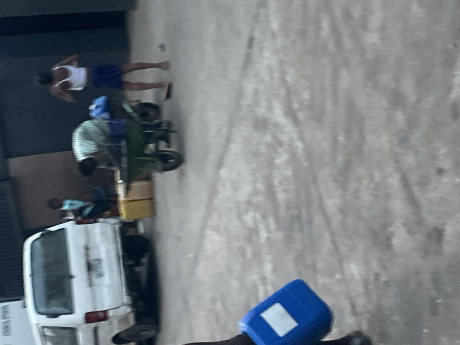 white van parked near a building. Two men are seen, one in a blue mask, and the other bare-chested. A green wheelbarrow with boxes on top sits near the van. The background features a large gray area, possibly a road or pavement. The overall scene suggests loading or unloading materials near a building.