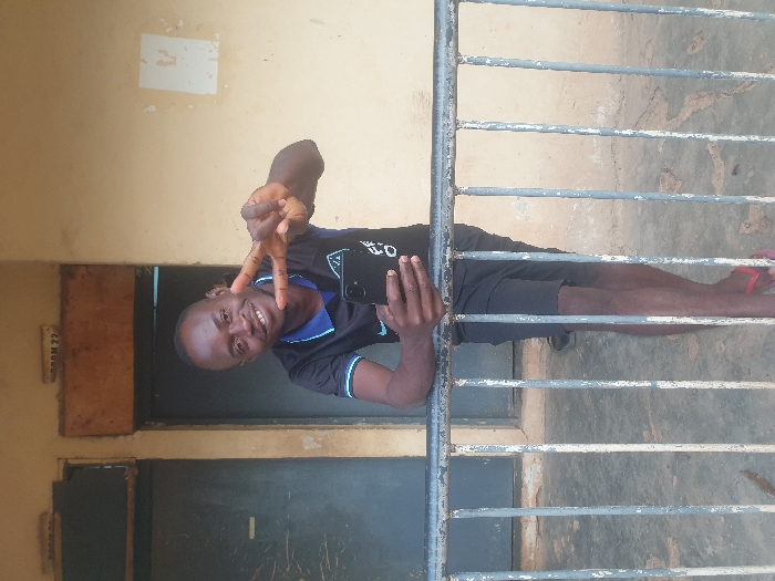A man is positioned in front of a barred window, possibly a gate, taking a selfie with his mobile phone. He is wearing a dark blue shirt with light blue trim and dark shorts. He holds up two fingers in a peace sign while smiling. The background features a painted wall, and a door labeled "ROOM 22" is visible on the left. The ground is concrete.