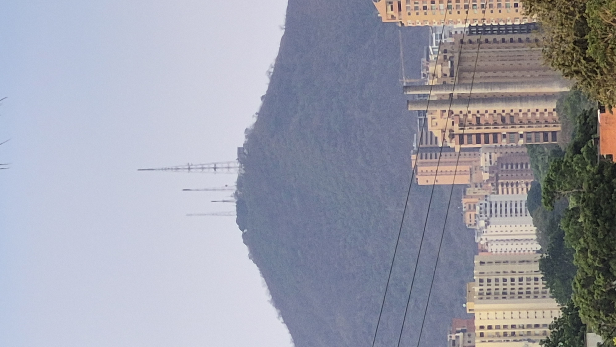 The image depicts a cityscape with a mountain in the background. In the middle ground, there are several tall buildings. There are communication towers on top of the mountain. Power lines cut across the view between the buildings and the mountain. Greenery is visible on the right side of the image. The sky is overcast. The image is rotated 90 degrees clockwise. Although the image is similar to Valencia, Venezuela, the specific location within the city cannot be determined from the image.