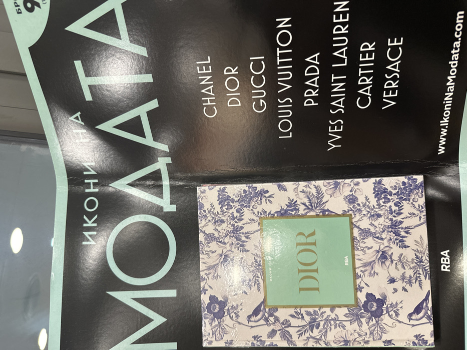 The image displays an indoor retail or exhibition scene in Stara Zagora, Bulgaria. The primary subject is a glossy black poster or display panel featuring light blue Cyrillic text at the top, which translates to "ИКОНИ НА МОДАТА" (Icons of Fashion). Below this, a vertical list of luxury brand names is prominently displayed in white capital letters: CHANEL, DIOR, GUCCI, LOUIS VUITTON, PRADA, YVES SAINT LAURENT, CARTIER, and VERSACE. A website address, "www.IkoniNaModata.com," is visible at the bottom right of the poster. In the foreground, partially obscuring the lower left portion of the poster, rests a hardcover book. Its cover is adorned with a detailed blue and white floral and bird pattern. Centered on the book cover is a light teal or mint green rectangular label with the word "DIOR" in gold capital letters. Below "DIOR," the publisher "RBA" is printed in small white text. Reflections of several circular overhead lights are visible on the glossy surfaces of both the poster and the book's label. No people, discernible actions, or interactions are present within the frame.