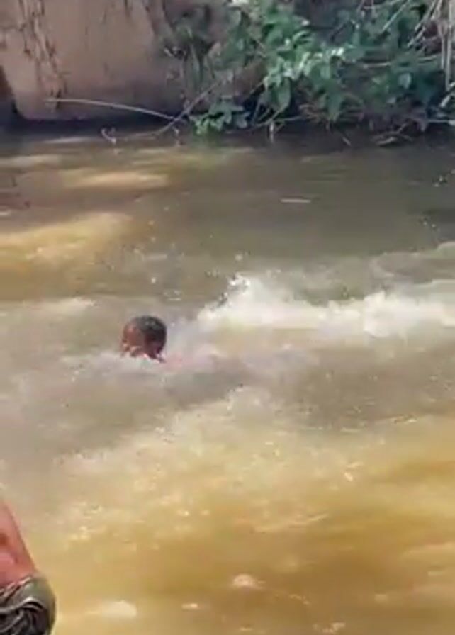 group of children swimming and playing in a muddy river