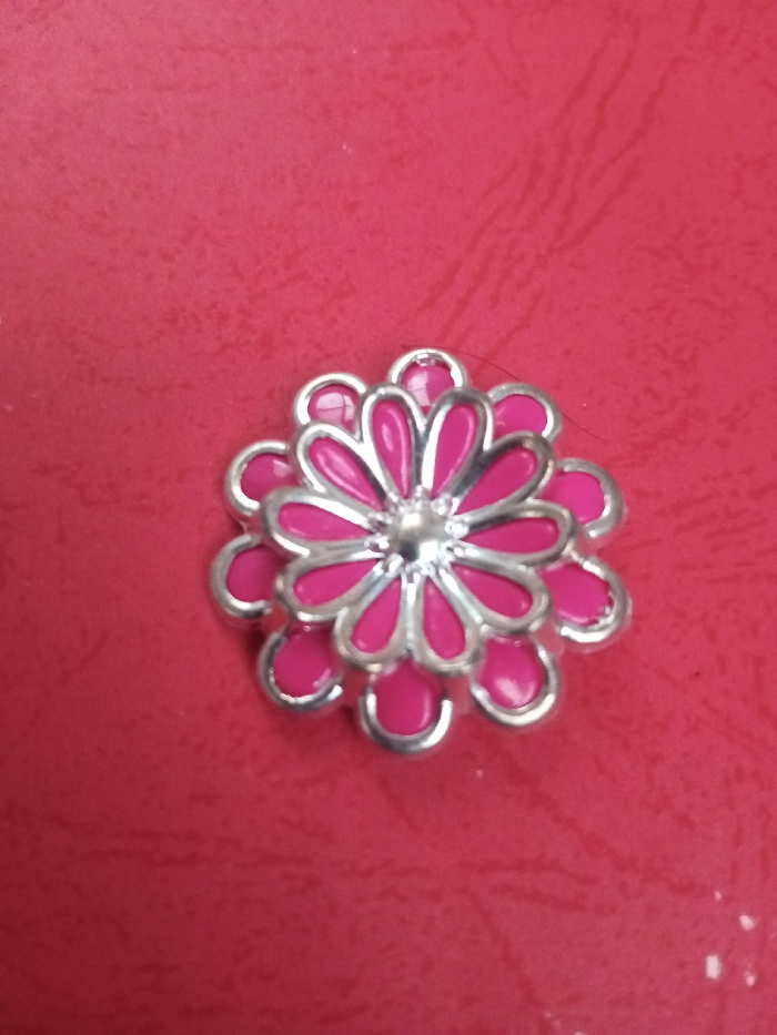 A pink, silver-trimmed flower brooch lies on a red surface. The flower has two layers of rounded petals, each outlined in silver. The center of the flower is also silver. The background has a slightly textured appearance. The brooch is positioned on the upper-right corner of the frame.