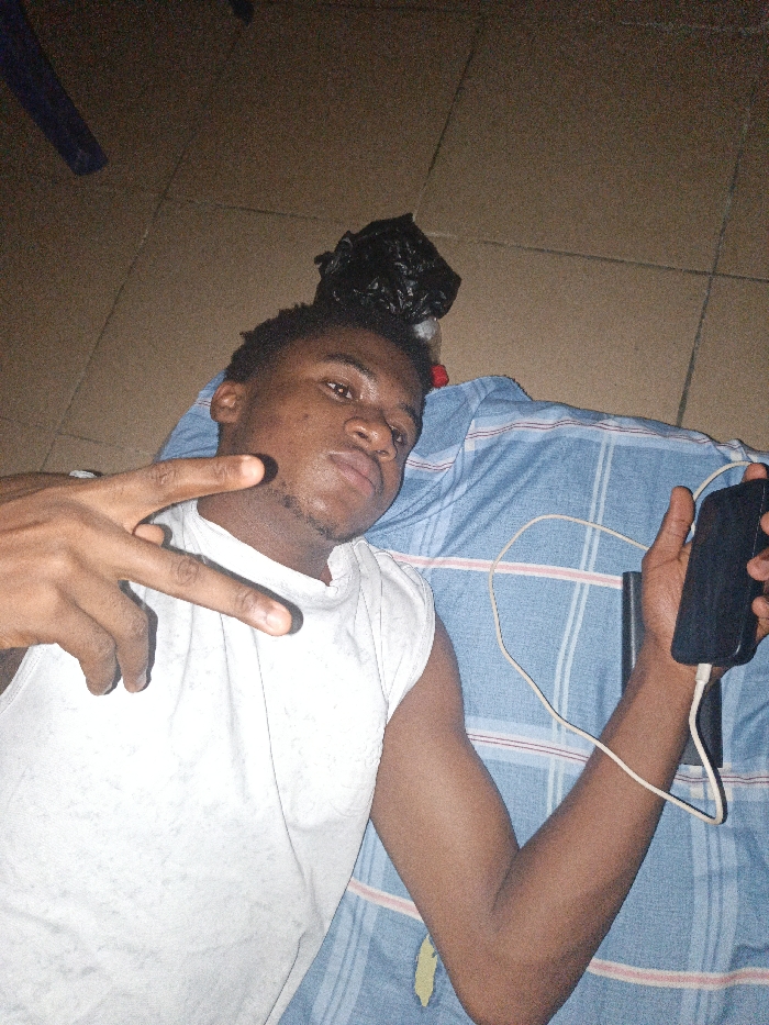 A young man lies on his back on a bed covered with a blue and white striped sheet. He is wearing a white sleeveless shirt. He holds a black smartphone in his right hand, which is connected to a white charging cable. His left hand is raised, making a peace sign. A black trash bag sits behind his head. The floor is tiled with light brown and beige tiles.