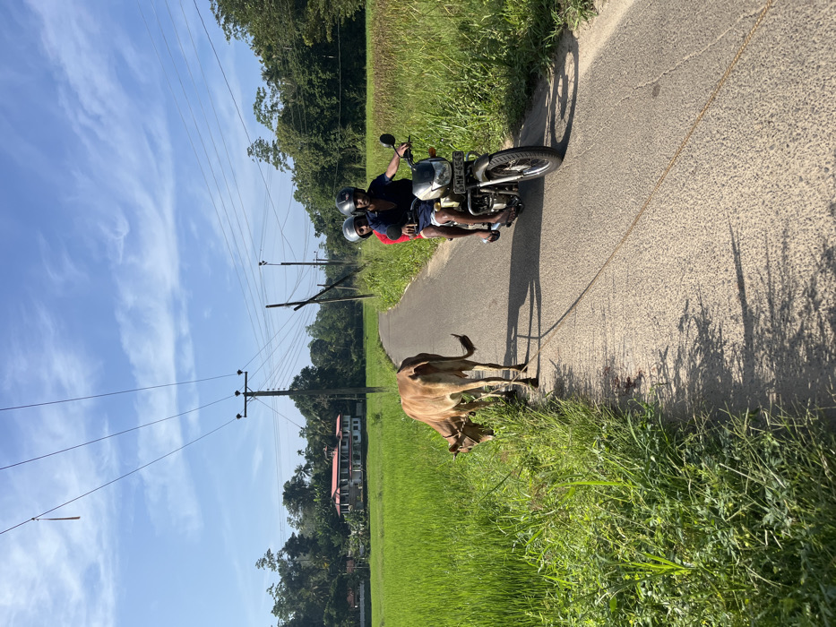 Two people ride a motorcycle down a rural road, each wearing a helmet. A brown cow walks alongside the road, tethered to the motorcycle with a rope. Lush green rice fields stretch out beside the road, punctuated by utility poles and a house in the distance. A clear, blue sky with wispy clouds forms the backdrop, highlighting the scene under bright sunlight.